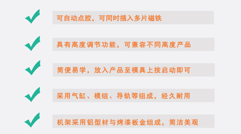 ◆ 點膠和插磁一體,先點膠,再插磁 ◆ 可同時插入多片磁鐵,帶磁不帶磁可通用 ◆ 簡便易學,只需放入產品至模具上再按下啟動按鈕即可 ◆ 運動部分采用無桿氣缸、導軌、直線軸承等,經久耐用 ◆ 機架采用鋁型材與烤漆鈑金組成,簡潔美觀