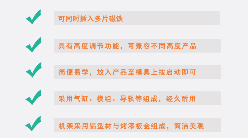 ◆ 可同時(shí)插入多片磁鐵,一槽可插多次 ◆ 簡(jiǎn)便易學(xué),只需放入產(chǎn)品至模具上再按下啟動(dòng)按鈕即可 ◆ 運(yùn)動(dòng)部分采用無(wú)桿氣缸、導(dǎo)軌、直線軸承等,經(jīng)久耐用 ◆ 機(jī)架采用鋁型材與烤漆鈑金組成,簡(jiǎn)潔美觀