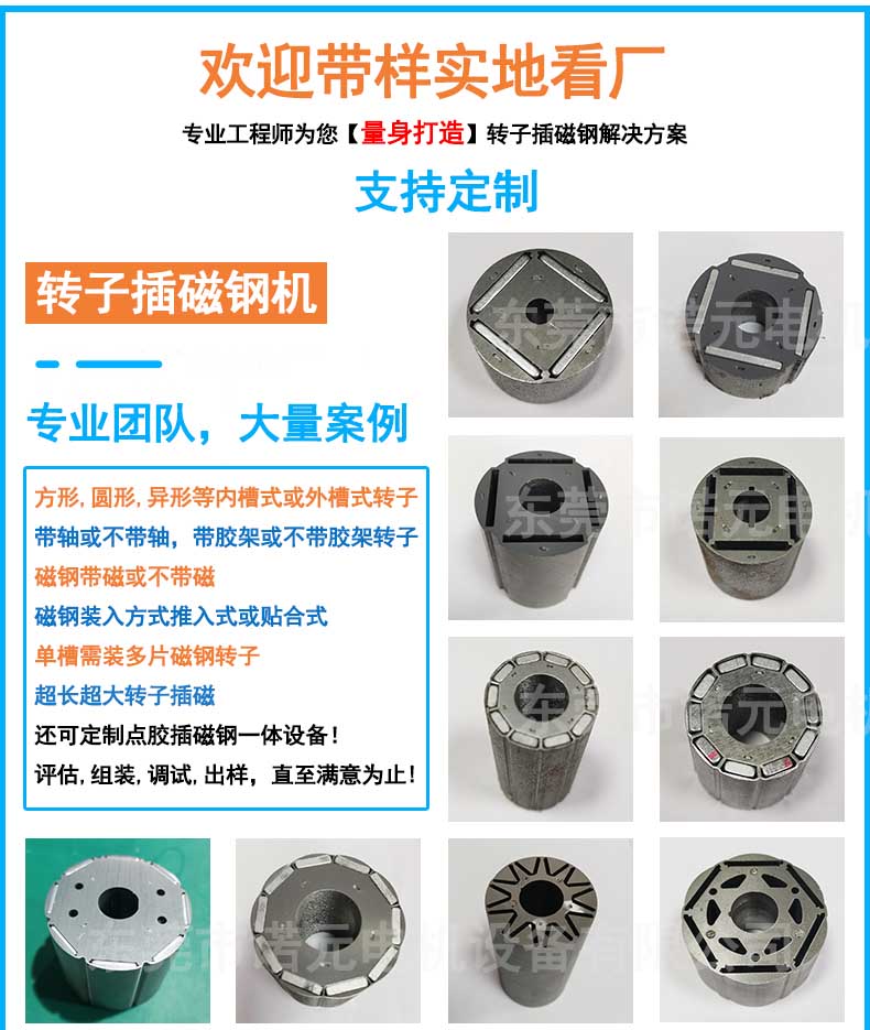 適用于滾筒電機(jī)、伺服電機(jī)、水泵電機(jī)等轉(zhuǎn)子鐵芯插磁,適用但不限制于無(wú)刷電機(jī)。