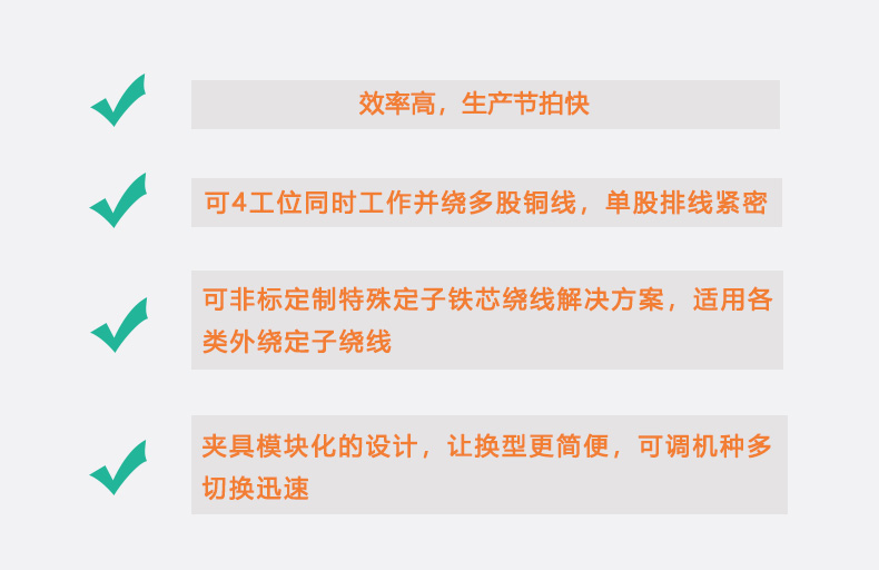◆ 效率高,生產節拍快,可調機種多、切換迅速 ◆ 可4工位同時工作并繞多股銅線,單股排線緊密 ◆ 可非標定制特殊定子鐵芯繞線解決方案 ◆ 夾具模塊化的設計,讓換型更簡便
